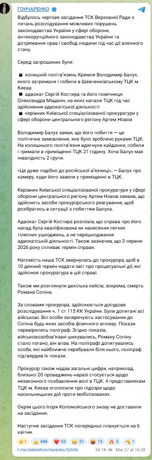 Відбулося чергове засідання Тимчасової слідчої комісії (ТСК) Верховної Ради щодо розслідування можливих порушень законодавства України у сфері оборони, антикорупційного законодавства України та дотримання прав і свобод людини під час дії воєнного стану. Про це повідомив народний депутат України Олексій Гончаренко на своїй сторінці в Telegram у п’ятницю, 27 березня.