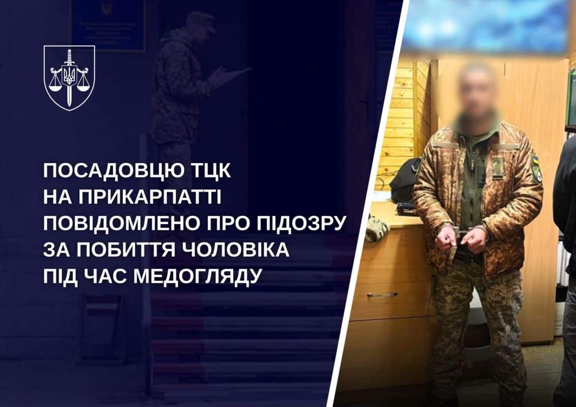 В Івано-Франківській області правоохоронці повідомили про підозру заступнику начальника територіального центру комплектування (ТЦК та СП), який під час медогляду жорстоко побив військовозобов’язаного чоловіка. Про це 27 листопада повідомила пресслужба Офісу генерального прокурора.