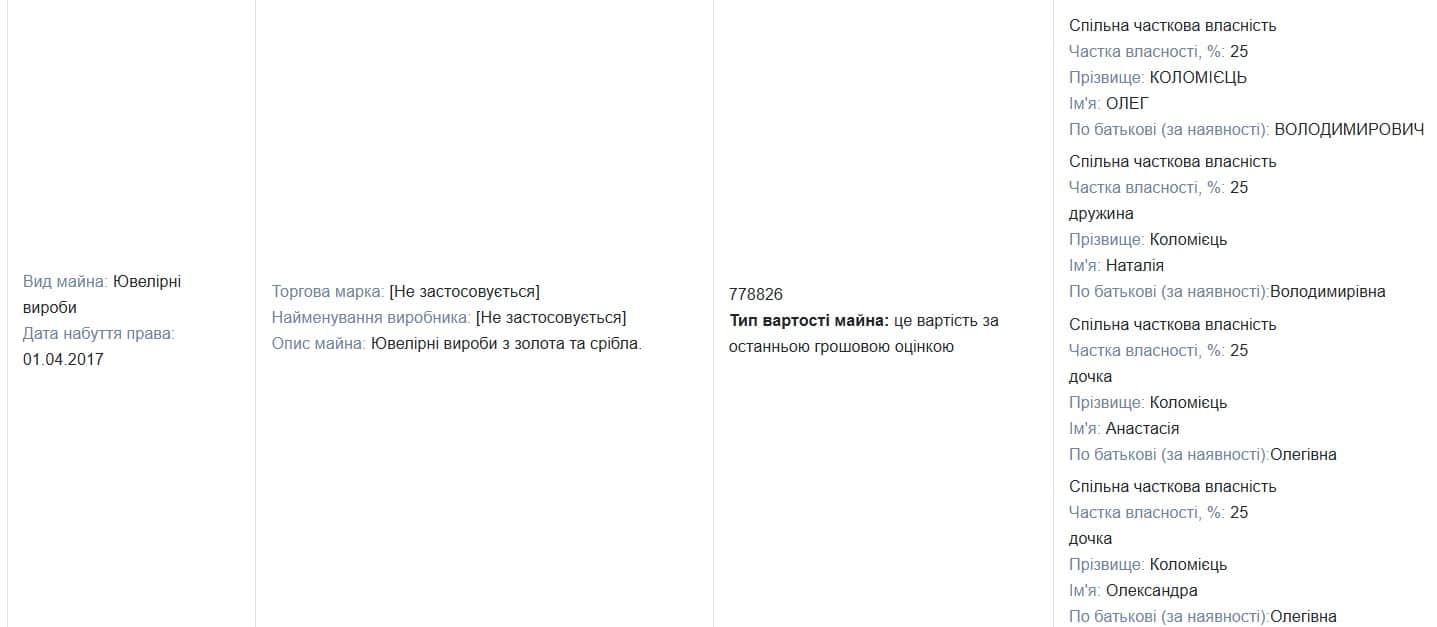 Також у документі вказано ювелірні вироби із золота та срібла, загальна вартість яких становить 778 тисяч 826 гривень.