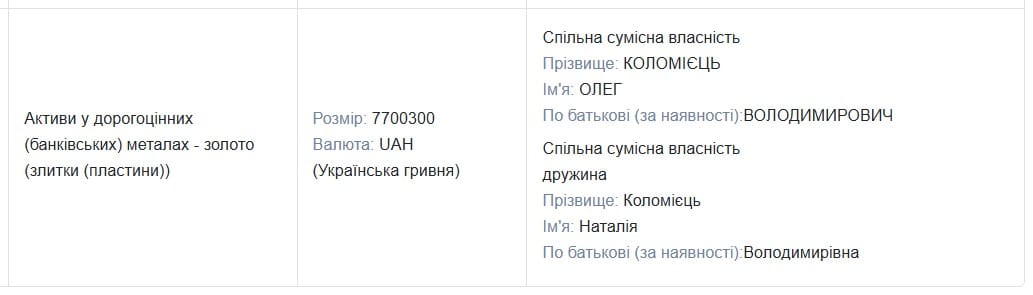 Згідно з документом, у власності військовослужбовця перебувають золоті злитки на суму 7 млн 700 тис. 300 грн. За актуальними цінами на дорогоцінні метали ця сума приблизно відповідає 1 кілограму 74,9 грама золота.