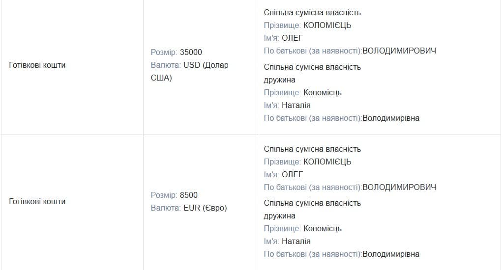 Окрім цього, у декларації зазначені готівкові заощадження у валюті. Зокрема, родина задекларувала 35 тисяч доларів США та 8,5 тисячі євро, які вказані як спільна власність подружжя.