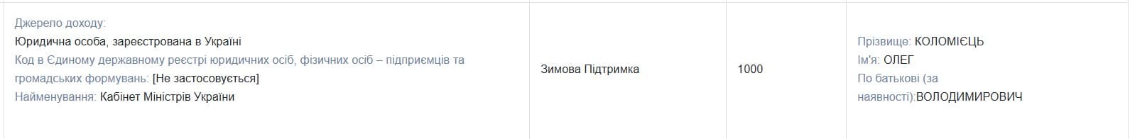 У декларації також зазначено, що військовослужбовець користувався державними програмами «Зимова підтримка» та «Національний кешбек».