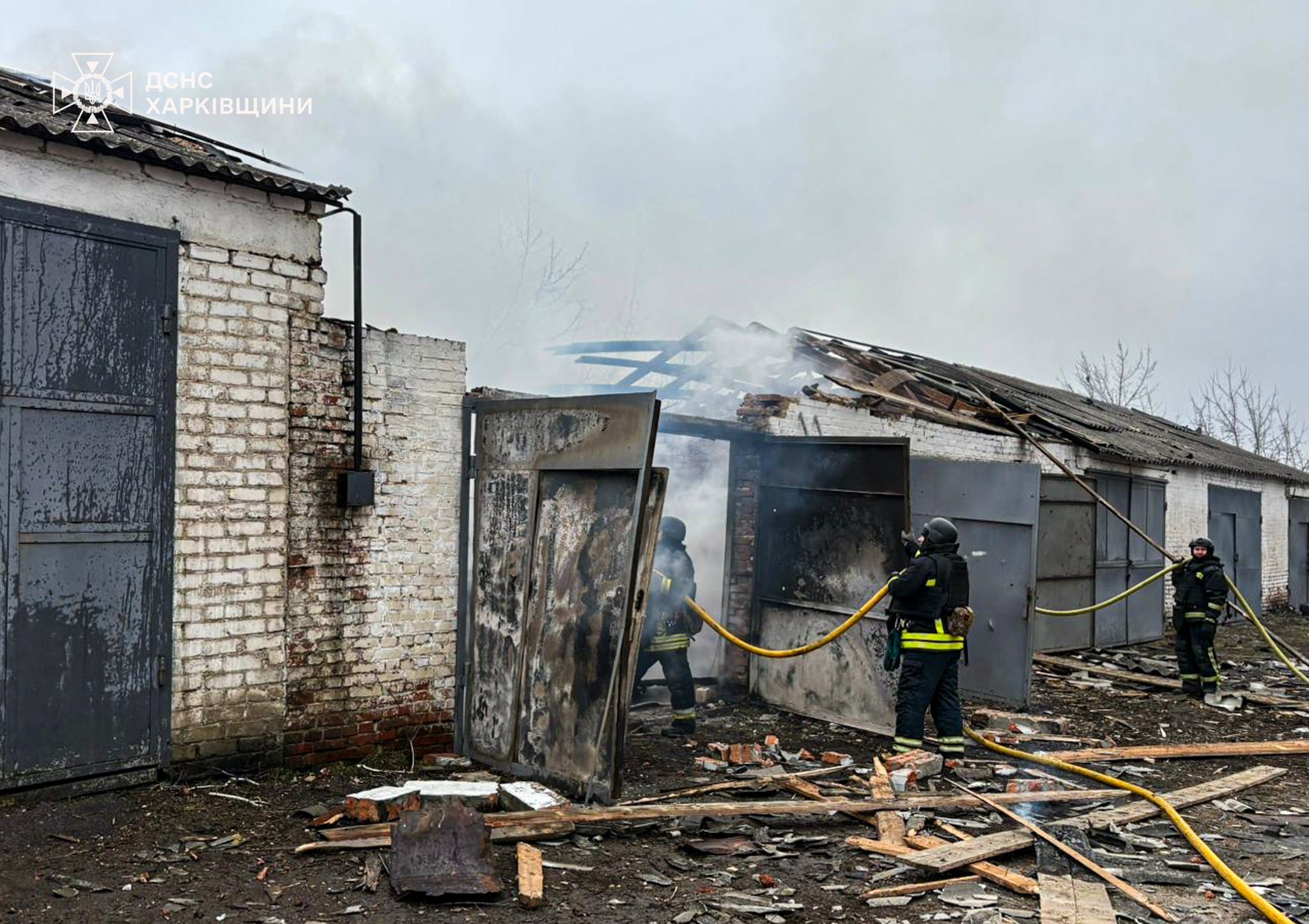 ☝️ Внаслідок влучання БпЛА на території медичної установи сталися руйнування та загоряння двох гаражних боксів. Площа пожежі склала близько 100 квадратних метрів. Також зафіксовано пошкодження лінії електропередач.