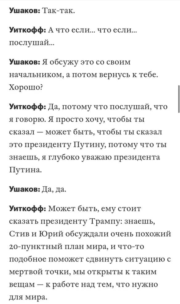 У матеріалі також ідеться про те, що під час бесіди Віткофф обговорив з ушаковим можливі умови майбутньої «мирної угоди» між росією та Україною, які пізніше стали основою плану з 28 пунктів. Він відкрито натякав, що бачив спосіб домовитися щодо територій, хоча й намагався подати це як прагматичний підхід.