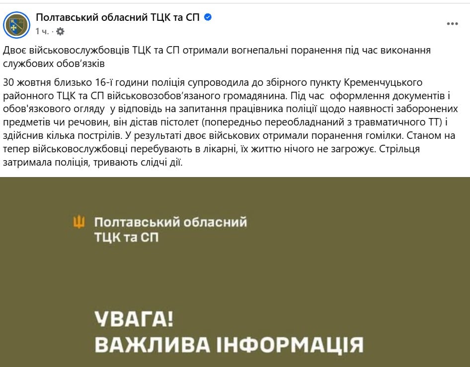 ☝️ У Полтавському обласному ТЦК підтвердили факт стрілянини. У їхній офіційній заяві зазначено, що близько 16:00 поліція супроводжувала військовозобов’язаного до збірного пункту Кременчуцького районного ТЦК та СП. Під час оформлення документів і перевірки на наявність заборонених предметів чоловік витягнув пістолет і зробив кілька пострілів.