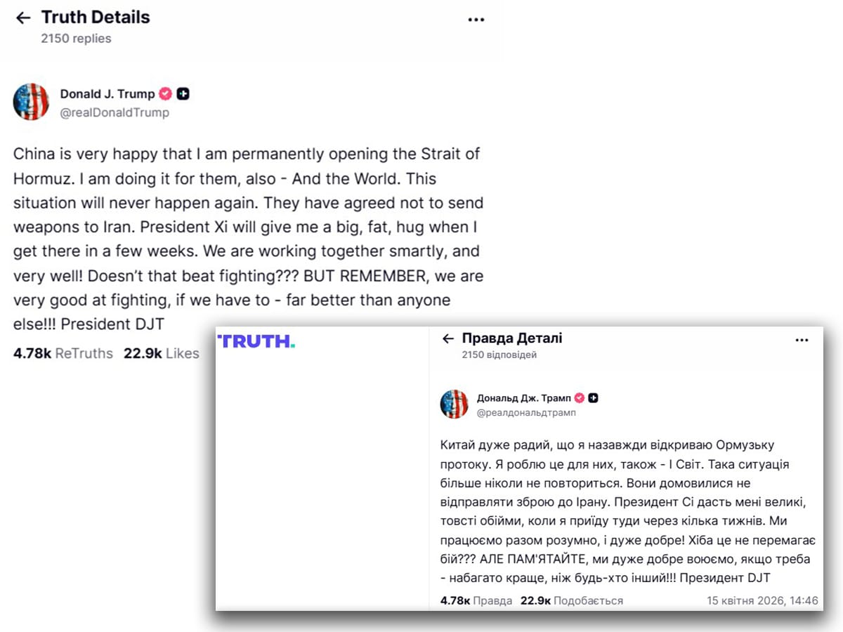 📢 «Китай дуже радий, що я назавжди відкриваю Ормузьку протоку. Я роблю це також заради них – і заради всього світу», – написав Трамп.
