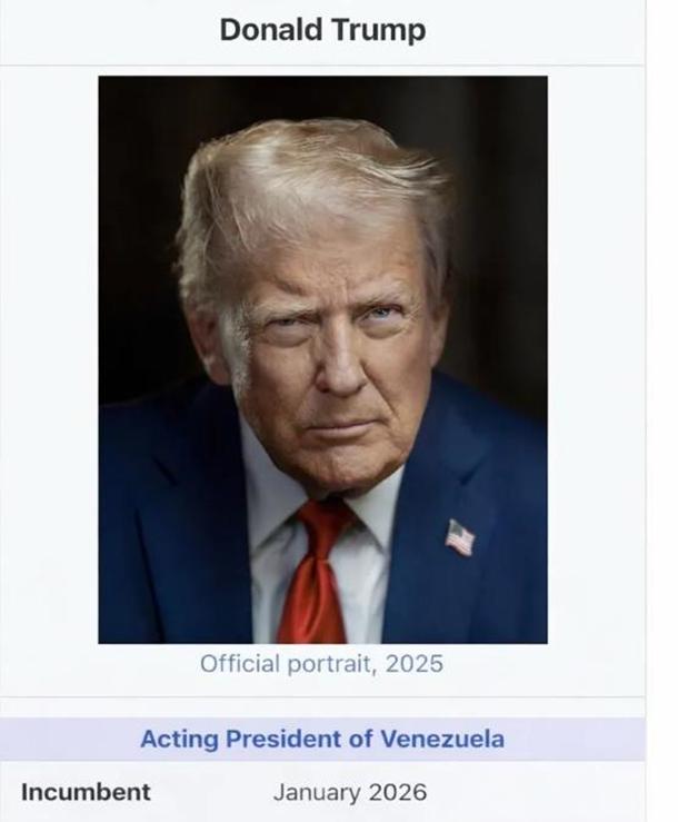 📢 Під опублікованим зображенням розміщено підпис: «Виконувач обов’язків президента Венесуели. Чинний — січень 2026».