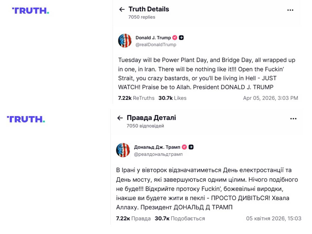 📢 «У вівторок в Ірані буде День електростанції та День мосту, одночасно. Нічого схожого ще не було!!! Відкрийте кляту протоку, божевільні виродки, інакше будете жити в пеклі – просто почекайте! Слава Аллаху», — написав Трамп.