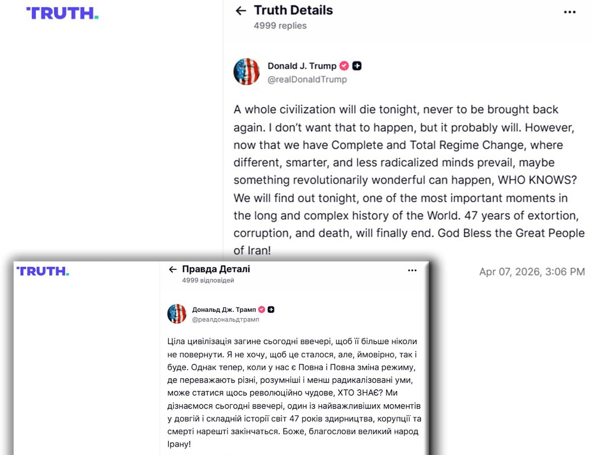 📢 «Ціла цивілізація сьогодні загине вночі, і її вже ніколи не повернути. Я не хочу, щоб це сталося, але, ймовірно, так і буде. Однак тепер, коли ми маємо повну і тотальну зміну режиму, де переважають інші, розумніші та менш радикальні уми, можливо, станеться щось революційно чудове, хто знає? Ми дізнаємося це сьогодні вночі, в один із найважливіших моментів у довгій і складній історії світу. 47 років здирництва, корупції та смерті нарешті закінчаться. Боже, благослови великий народ Ірану!», – написав він.