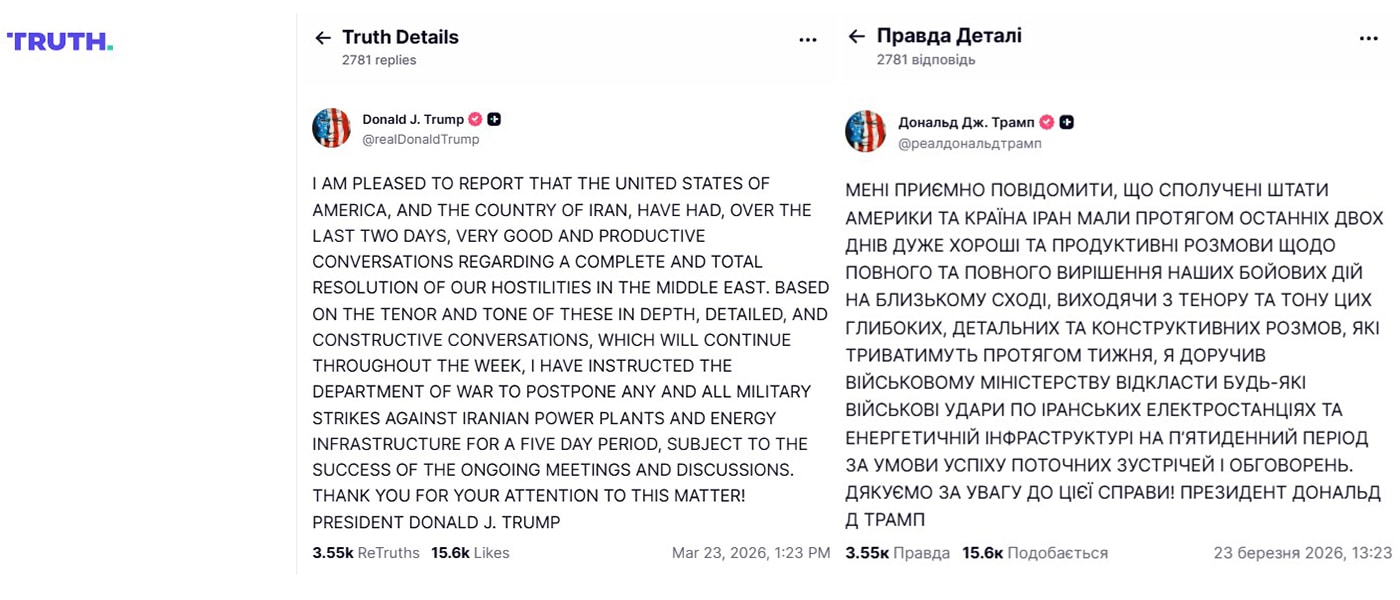 📢 «Виходячи з характеру та тону цих глибоких, детальних та конструктивних переговорів, які продовжуватимуться протягом тижня, я дав вказівку Міністерству оборони відкласти всі військові удари проти іранських електростанцій та енергетичної інфраструктури на п’ять днів, за умови успіху поточних зустрічей та дискусій», – заявив Дональд Трамп.