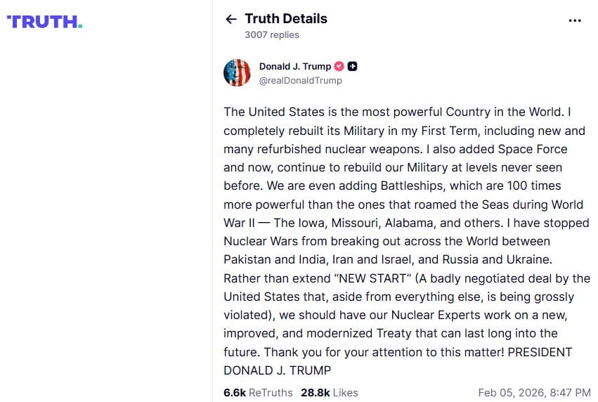📢 «Я повністю відновив нашу армію, включно з новими та багатьма модернізованими ядерними озброєннями», – написав глава Білого дому.