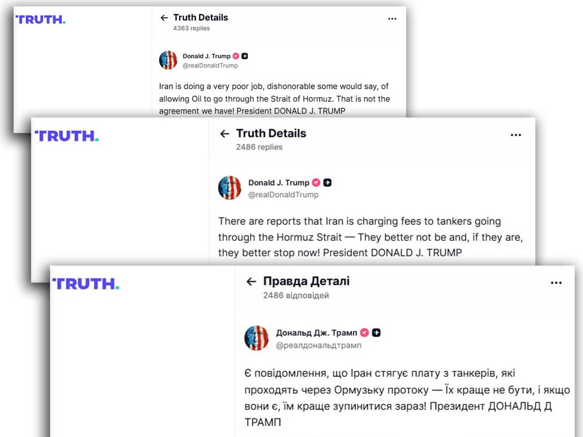 📢 «Є повідомлення про те, що Іран стягує плату з танкерів, які проходять через Ормузьку протоку – їм краще цього не робити, а якщо роблять, то краще припинити це негайно», — написав Трамп.