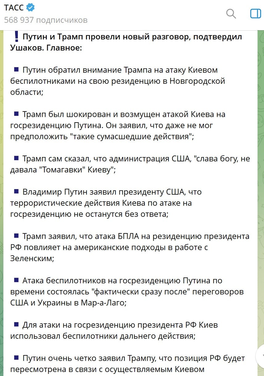 Водночас помічник глави кремля юрій ушаков розповів власну версію переговорів. За його твердженням, Трамп нібито був «шокований і обурений» заявами росії про атаку на резиденцію путіна.