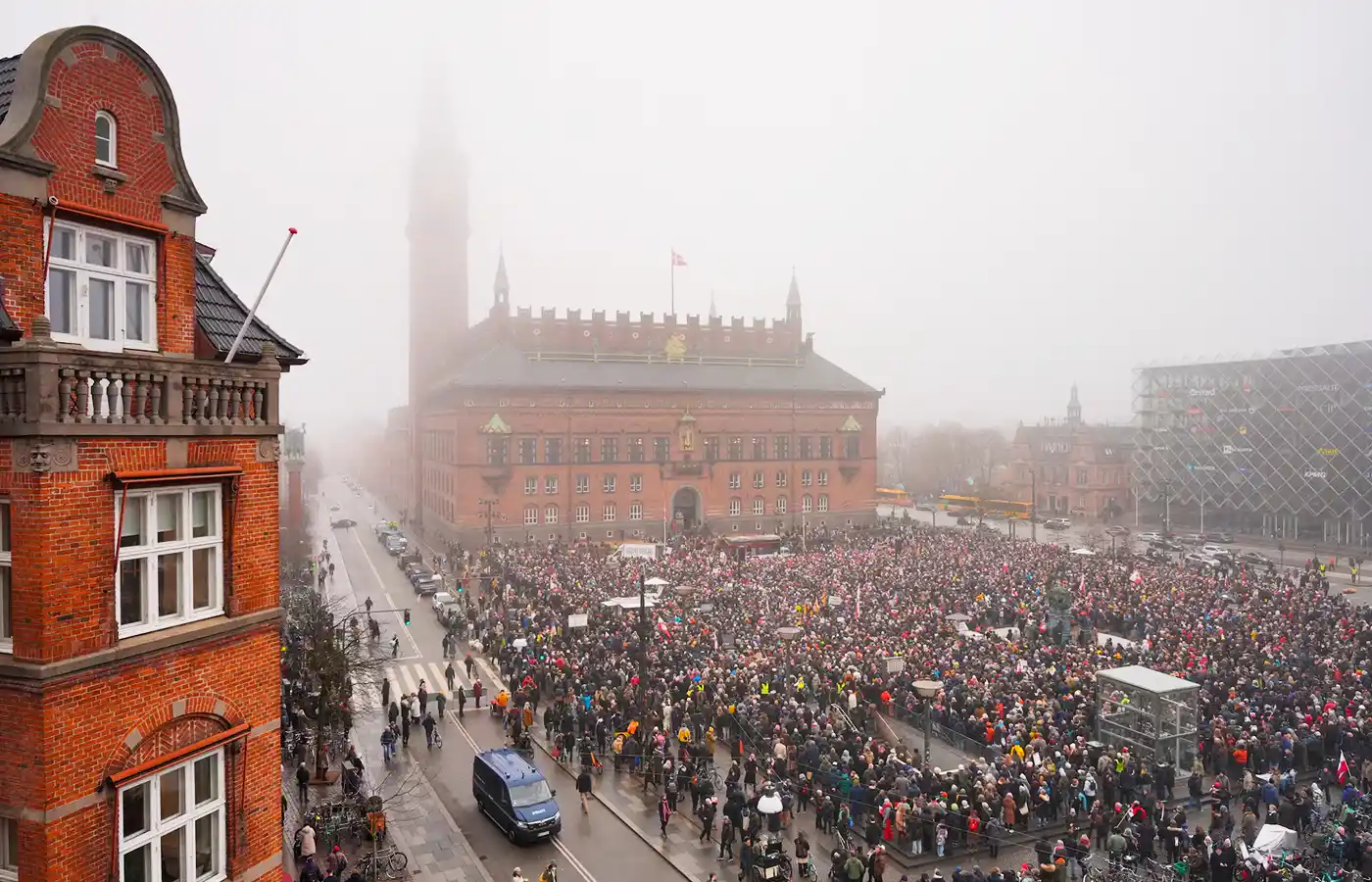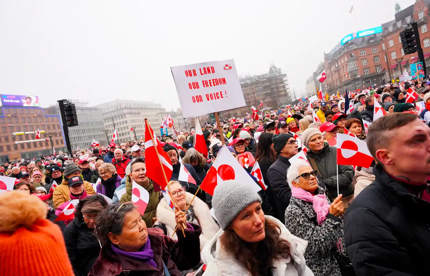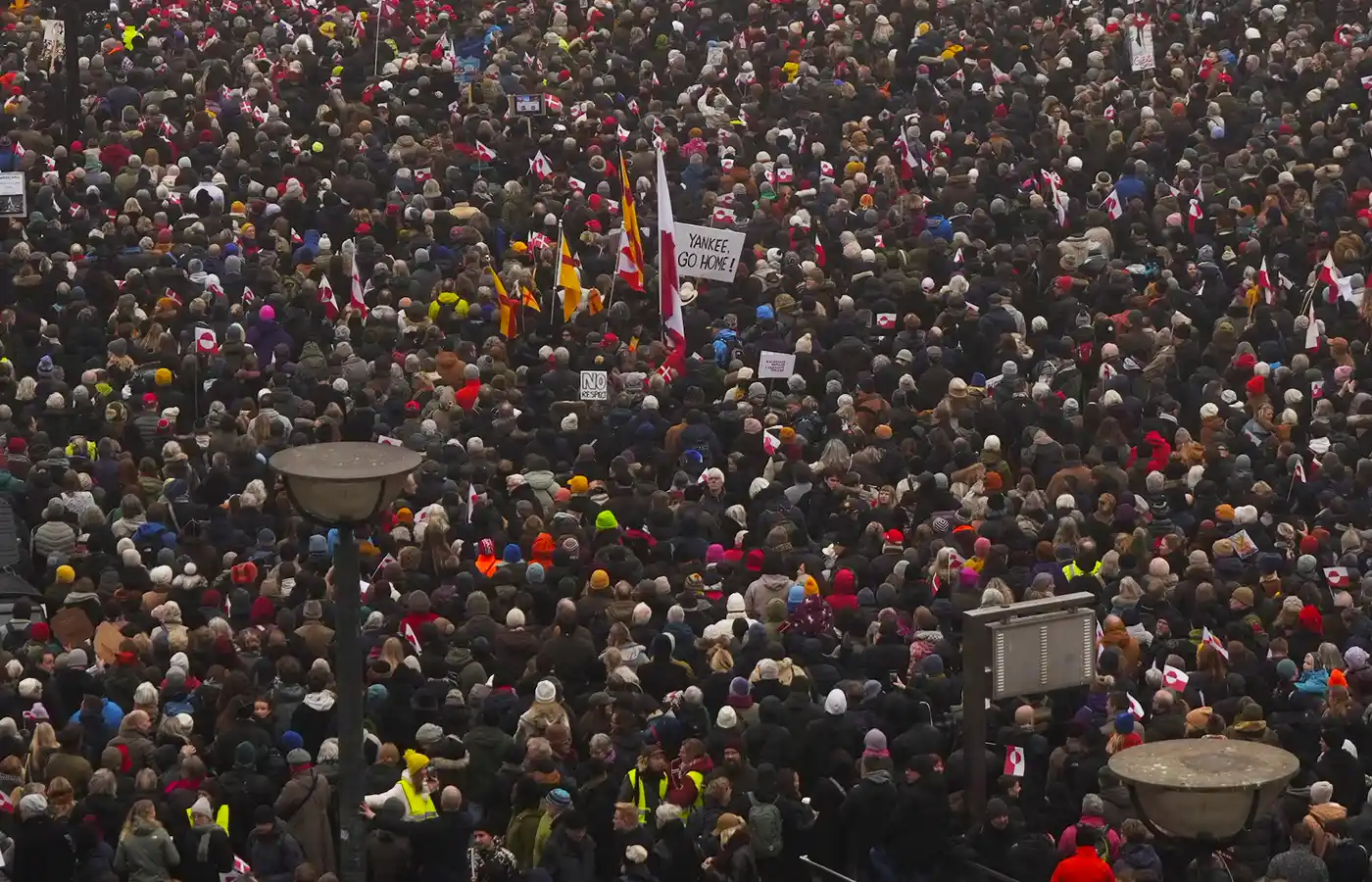 У столиці Данії демонстранти зібралися на площі біля будівлі міської ради Копенгагена, після чого організованою ходою рушили до посольства США. Учасники акції скандували гасла «Гренландія не продається», тримали транспаранти з написами на кшталт «Руки геть від Гренландії», а також несли прапори Гренландії.