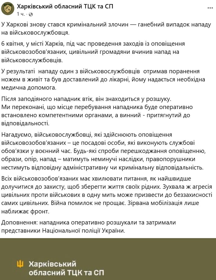 📢 «У місті Харків під час проведення заходів із оповіщення військовозобов’язаних, цивільний громадянин вчинив напад на військовослужбовців. Внаслідок нападу один із військовослужбовців дістав поранення ножем в живіт та був доправлений до лікарні, йому надається необхідна медична допомога», — йдеться у повідомленні.