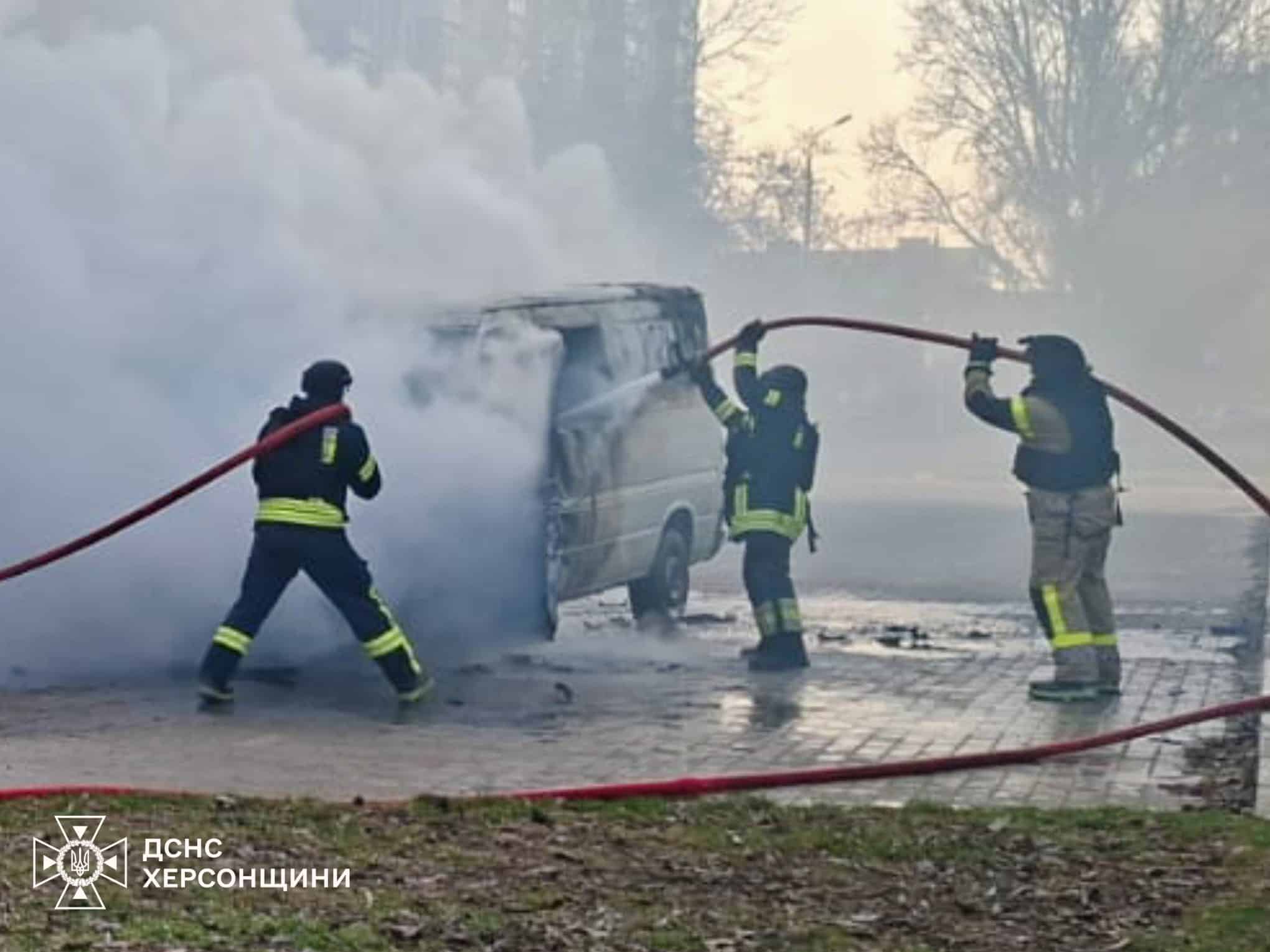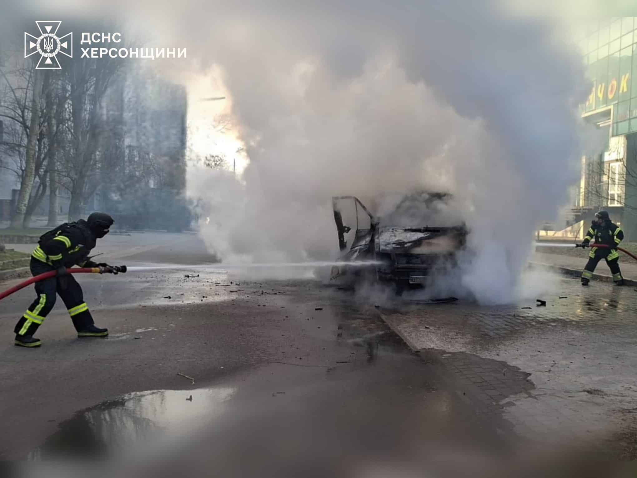 Через влучання російського безпілотника у Херсоні загорівся мікроавтобус, унаслідок чого постраждав цивільний чоловік. Про це 15 березня повідомило Головне управління ДСНС у Херсонській області. За даними рятувальників, пожежу вдалося оперативно ліквідувати, попри загрозу повторних ударів.