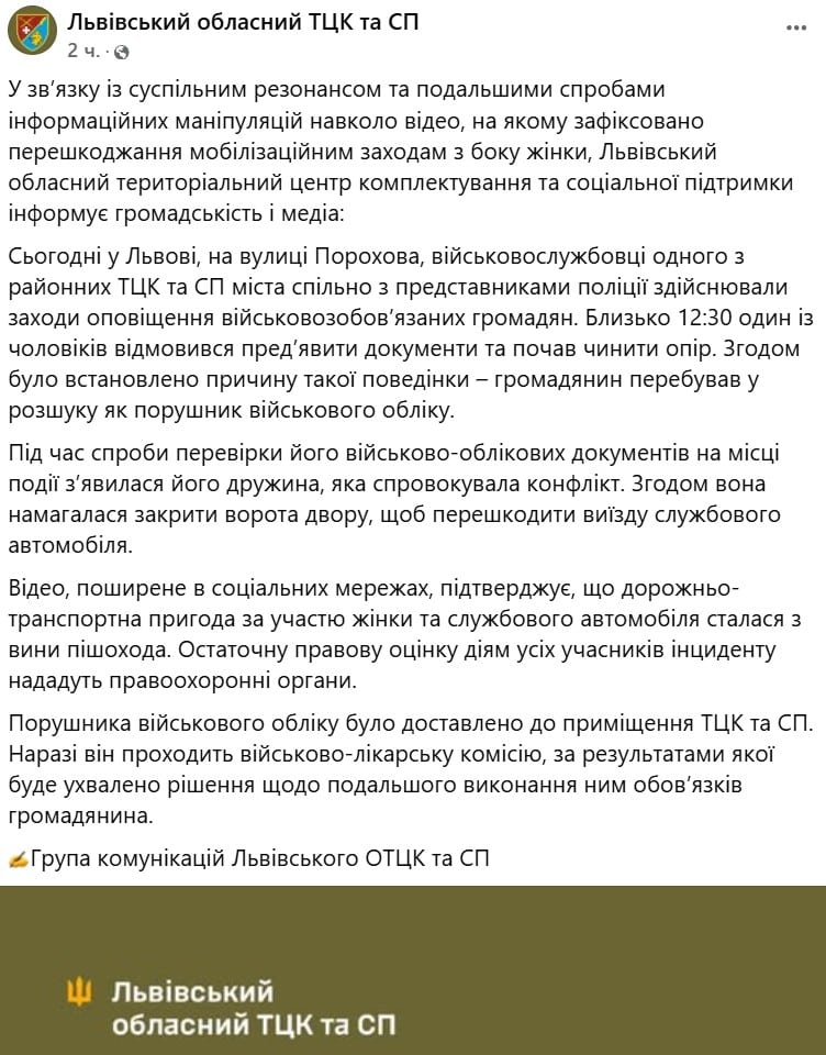 Свою версію оприлюднили й у Львівському обласному ТЦК та СП. Там зазначили, що під час перевірки документів чоловік, який перебував у «розшуку» за порушення правил військового обліку, відмовився їх пред’явити та почав чинити опір.