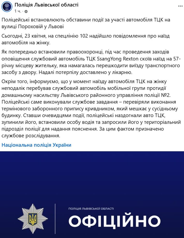 У Львові 23 квітня стався інцидент за участю службового автомобіля територіального центру комплектування ТЦК. Під час виїзду з двору транспортний засіб наїхав на 57-річну жінку. Правоохоронці призначили службове розслідування.