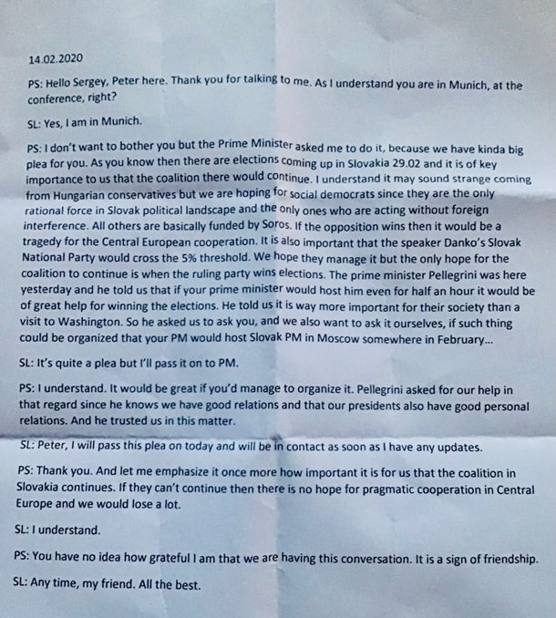 Опозиційний угорський журналіст Сабольч Паньї (Direkt36 та VSquare) опублікував на своїй Facebook-сторінці повну стенограму телефонної розмови міністра закордонних справ Угорщини Петера Сійярто з главою МЗС рф сергієм лавровим, що відбулася напередодні парламентських виборів у Словаччині 29 лютого 2020 року.