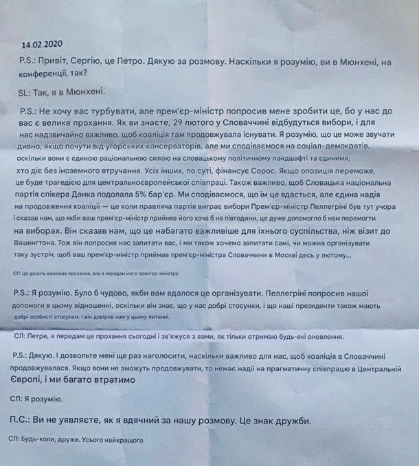 У розмові Сійярто прямо просить російську сторону сприяти перемозі тодішньої правлячої коаліції на чолі з прем’єр-міністром Петером Пеллегріні (партія «Голос – соціальна демократія», близька до Роберта Фіцо) та проходженню до парламенту Словацької національної партії (SNS) Андрея Данко.