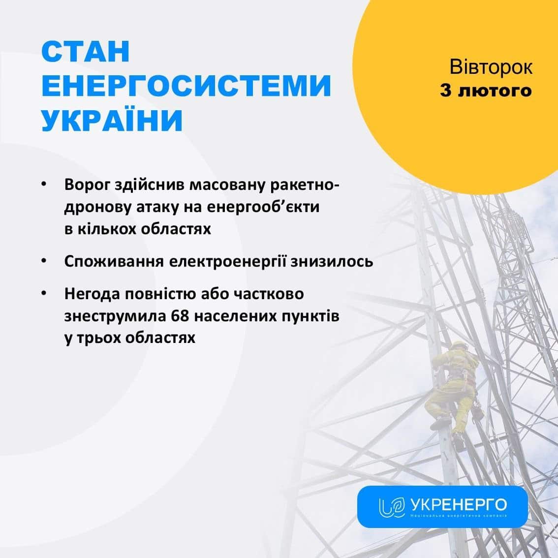 👉 Нагадаємо, у ніч на 3 лютого російські війська здійснили масовану атаку ракетами та дронами по Києву, Харкову, Дніпру та інших містах. Під ударами опинилися переважно житлова та енергетична інфраструктура у восьми областях України.