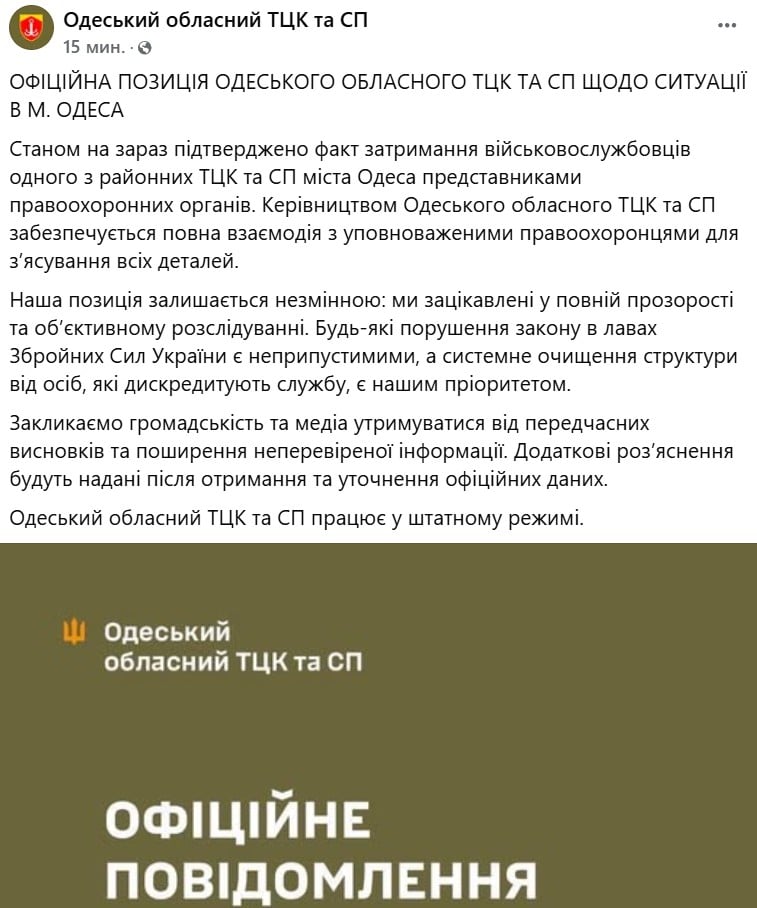 ℹ️ Наразі Одеський обласний ТЦК працює у штатному режимі. Додаткові деталі розслідування будуть оприлюднені після завершення офіційних процесуальних дій.
