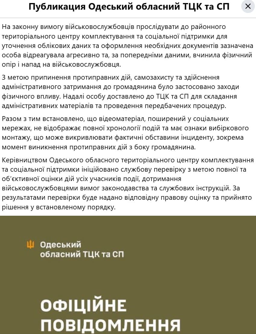 Керівництво Одеського обласного ТЦК та СП повідомило про початок службової перевірки з метою оцінки дій усіх учасників події та дотримання вимог чинного законодавства. За результатами перевірки буде надано правову оцінку інциденту та ухвалено відповідні рішення.