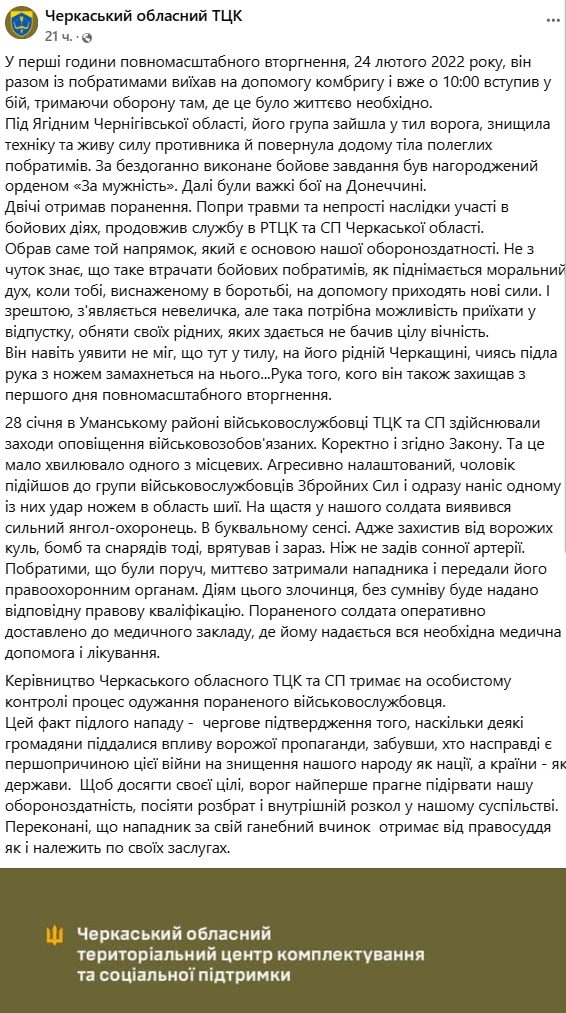 📢 «28 січня в Уманському районі військовослужбовці ТЦК та СП здійснювали заходи оповіщення військовозобов’язаних. Коректно і згідно із законом. Але це мало хвилювало одного з місцевих. Агресивно налаштований чоловік підійшов до групи військовослужбовців Збройних сил та одразу завдав одному з них удар ножем в ділянку шиї», – йдеться в офіційному повідомленні.