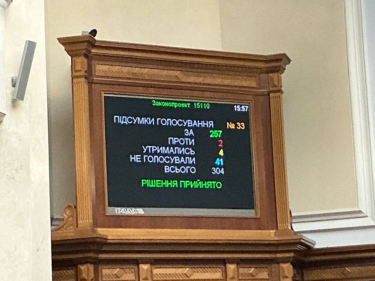 ✅Рішення ухвалено більшістю голосів народних депутатів — «за» проголосували 257 парламентарів. 🛑Двоє депутатів висловилися проти, ще 🟡четверо утрималися.