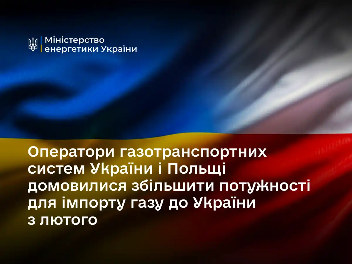 Імпорт газу з Польщі для України з початку лютого буде поетапно збільшено. Пропускна спроможність у цьому напрямку зросте з 15,3 млн кубометрів до 18,4 млн кубометрів газу на добу. Про це повідомив перший віцепрем’єр-міністр — міністр енергетики Денис Шмигаль у Telegram у вівторок, 27 січня.