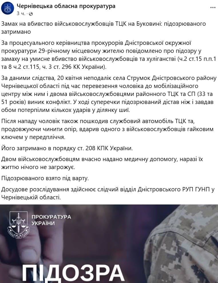 У Чернівецькій області правоохоронці повідомили про підозру 29-річному місцевому жителю у справі про активну протидію працівникам ТЦК. Дії чоловіка кваліфіковано як замах на умисне вбивство співробітників ТЦК та хуліганство. Про це повідомляє Чернівецька обласна прокуратура у Facebook.