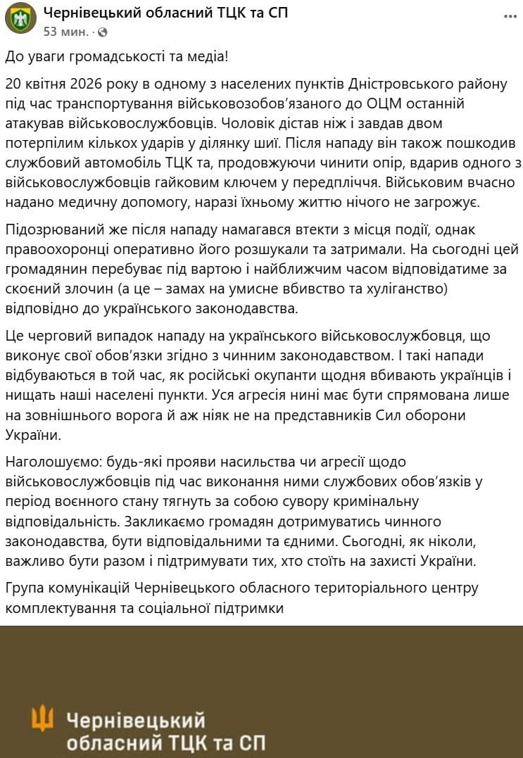 📢 «20 квітня 2026 року в одному з населених пунктів Дністровського району під час транспортування військовозобов’язаного до ОЦМ останній атакував військовослужбовців. Чоловік дістав ніж і завдав двом потерпілим кількох ударів у ділянку шиї. Після нападу він також пошкодив службовий автомобіль ТЦК та, продовжуючи чинити опір, вдарив одного з військовослужбовців гайковим ключем у передпліччя», – повідомили в ТЦК.