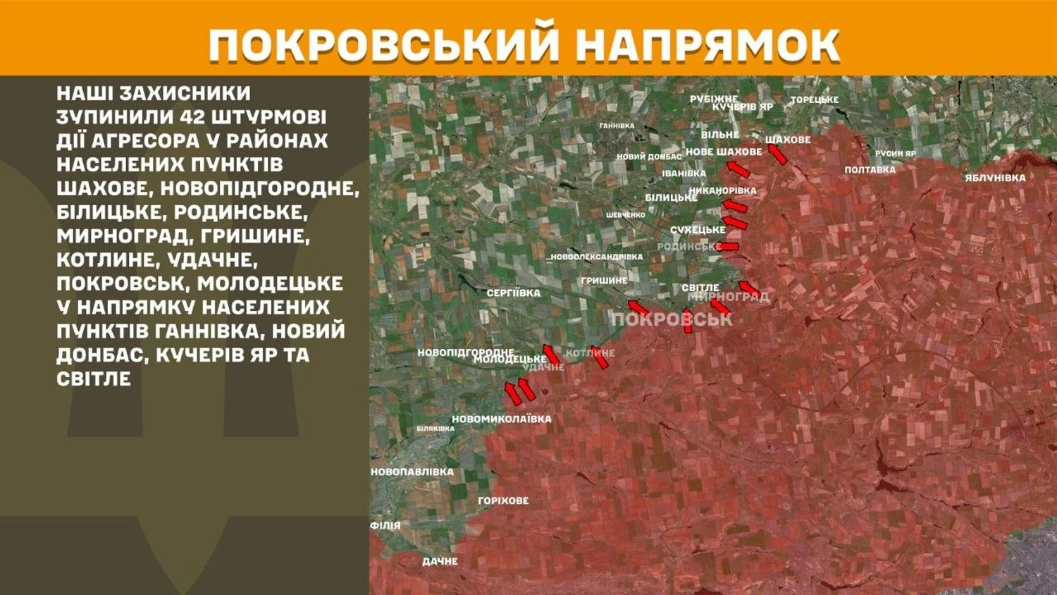 На Покровському напрямку українські захисники зупинили 42 штурмові дії агресора у районах населених пунктів Шахове, Новопідгородне, Білицьке, Родинське, Мирноград, Гришине, Котлине, Удачне, Покровськ, Молодецьке у напрямку населених пунктів Ганнівка, Новий Донбас, Кучерів Яр та Світле.