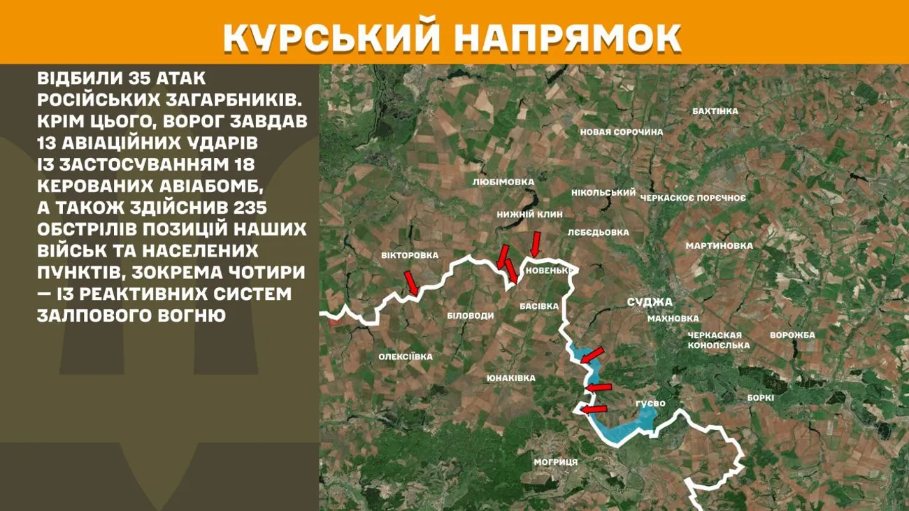 На Курському напрямку підрозділи Сил оборони України вчора відбили 35 атак російських загарбників. Крім цього, ворог завдав 13 авіаційних ударів із застосуванням 18 керованих авіабомб, а також здійснив 235 обстрілів позицій наших військ та населених пунктів, зокрема чотири — із реактивних систем залпового вогню.