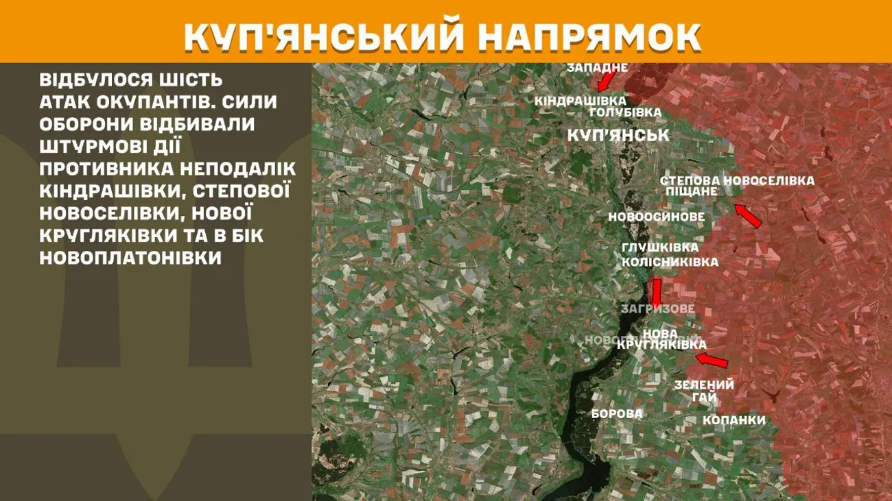 На Куп’янському напрямку відбулося шість атак окупантів. Сили оборони відбивали штурмові дії противника неподалік Кіндрашівки, Степової Новоселівки, Нової Кругляківки та в бік Новоплатонівки.
