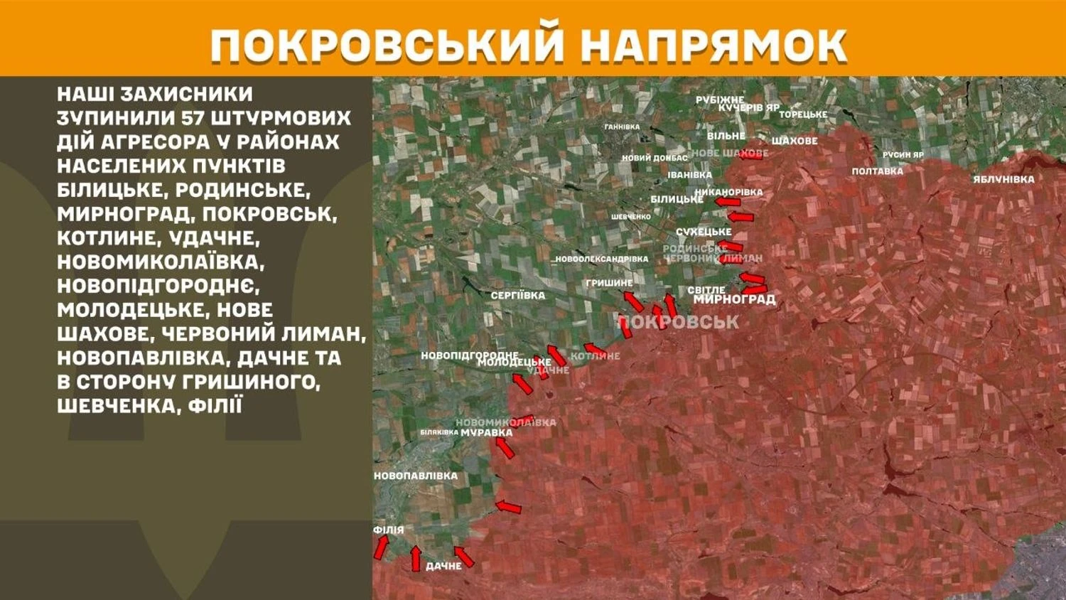 На Покровському напрямку українські захисники зупинили 57 штурмових дій агресора у районах населених пунктів Білицьке, Родинське, Мирноград, Покровськ, Котлине, Удачне, Новомиколаївка, Новопідгороднє, Молодецьке, Нове Шахове, Червоний Лиман, Новопавлівка, Дачне та в сторону Гришиного, Шевченка, Філії.