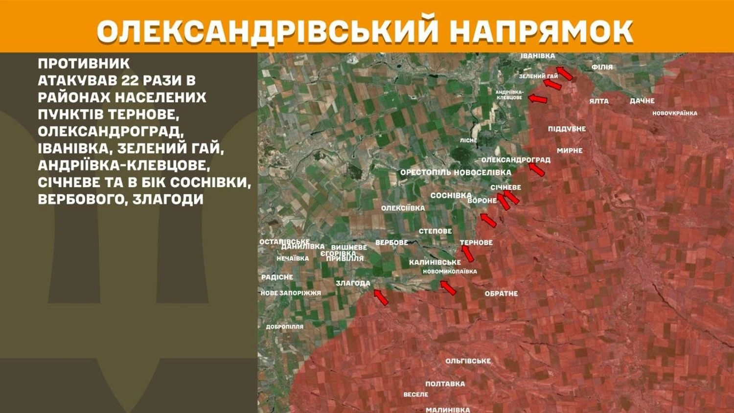 На Олександрівському напрямку противник атакував 22 рази в районах населених пунктів Тернове, Олександроград, Іванівка, Зелений Гай, Андріївка-Клевцове, Січневе та в бік Соснівки, Вербового, Злагоди.