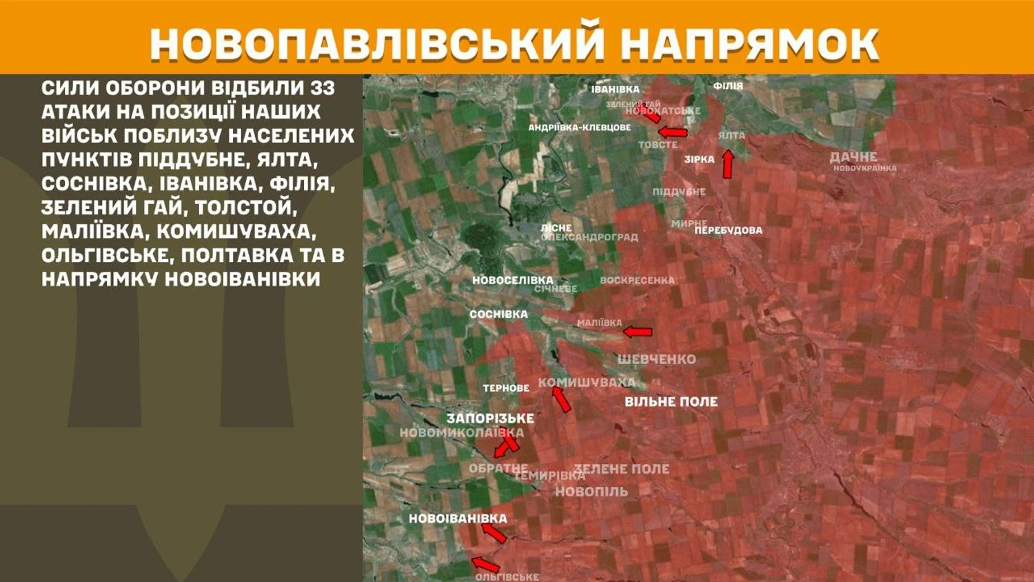 На Новопавлівському напрямку Сили оборони відбили 33 атаки на позиції поблизу населених пунктів Піддубне, Ялта, Соснівка, Іванівка, Філія, Зелений Гай, Толстой, Маліївка, Комишуваха, Ольгівське, Полтавка та в напрямку Новоіванівки.