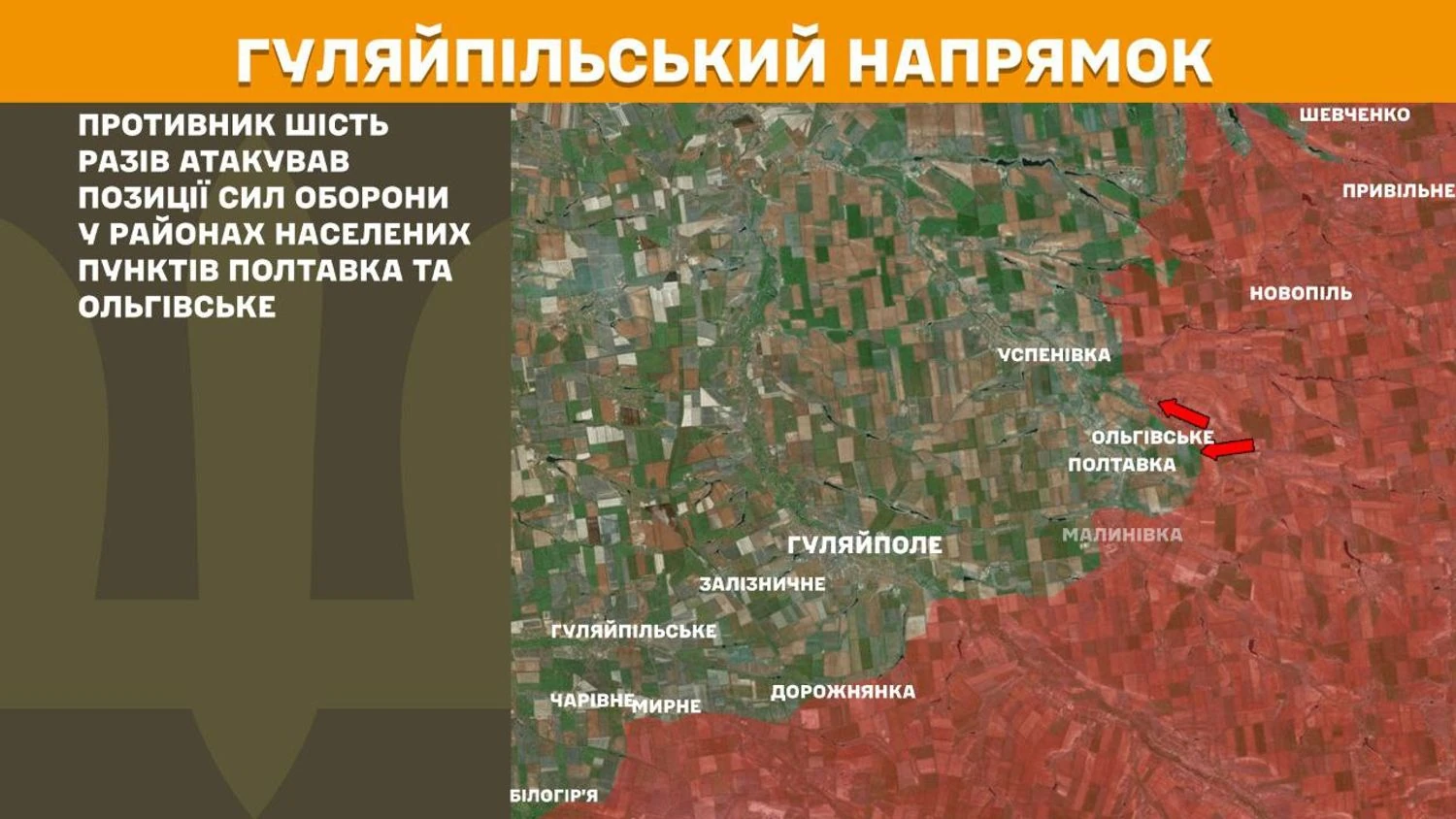На Гуляйпільському напрямку противник шість разів атакував позиції Сил оборони у районах населених пунктів Полтавка та Ольгівське.