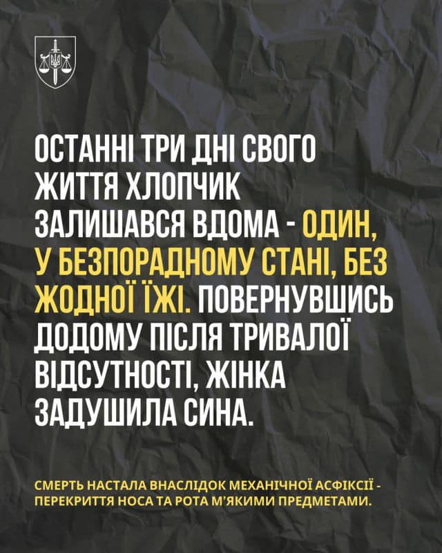 📢 «Повернувшись додому після тривалої відсутності, жінка задушила сина. За висновком судово-медичної експертизи, смерть настала внаслідок механічної асфіксії – перекриття носа та рота м’якими предметами», – зазначили у прокуратурі.