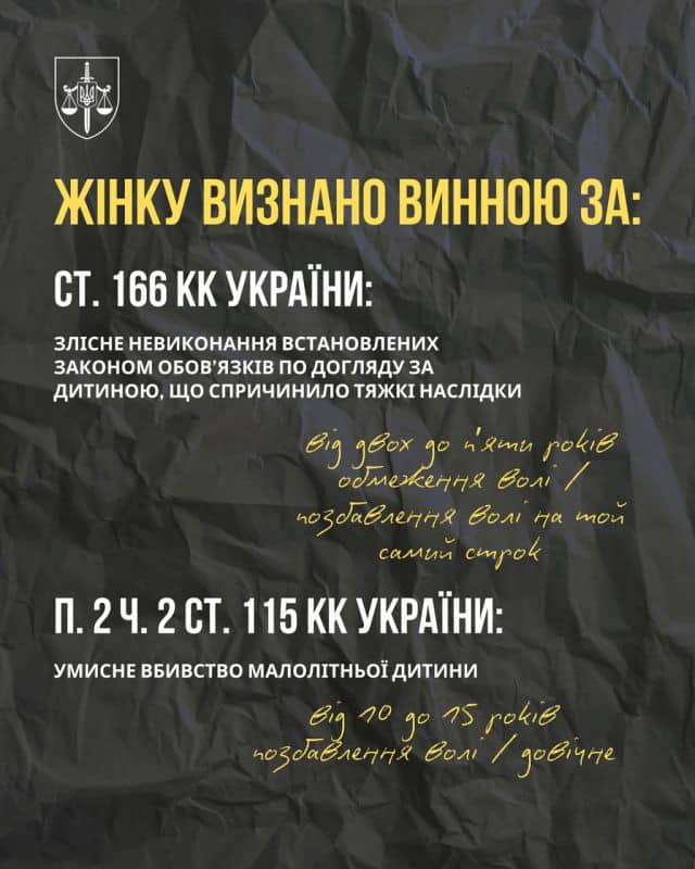 📢 «За підтримання публічного обвинувачення Чортківської окружної прокуратури Тернопільської області суд визнав винною жительку одного із сіл Чортківського району у злісному невиконанні обов’язків щодо догляду за дитиною, що спричинило тяжкі наслідки, та умисному вбивстві малолітнього сина за ст. 166, п. 2 ч. 2 ст. 115 КК України», – мовиться у повідомленні.
