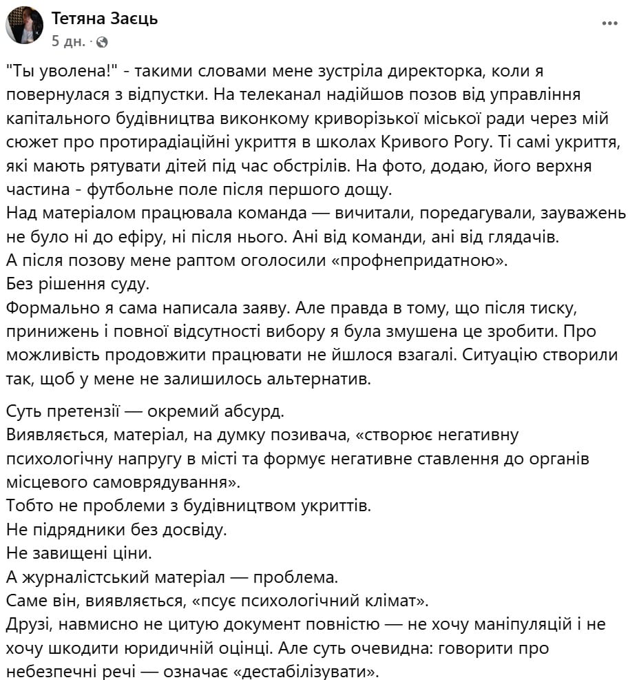 У Дніпрі звільнили журналістку та ведучу місцевого 11 каналу Тетяну Заєць після виходу сюжету про стан укриттів у Кривому Розі, через який управління капітального будівництва Криворізької міської ради подало судовий позов проти медіа. Про це повідомило видання «Перший Криворізький»