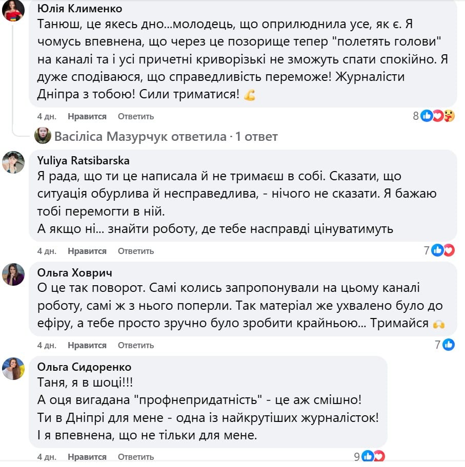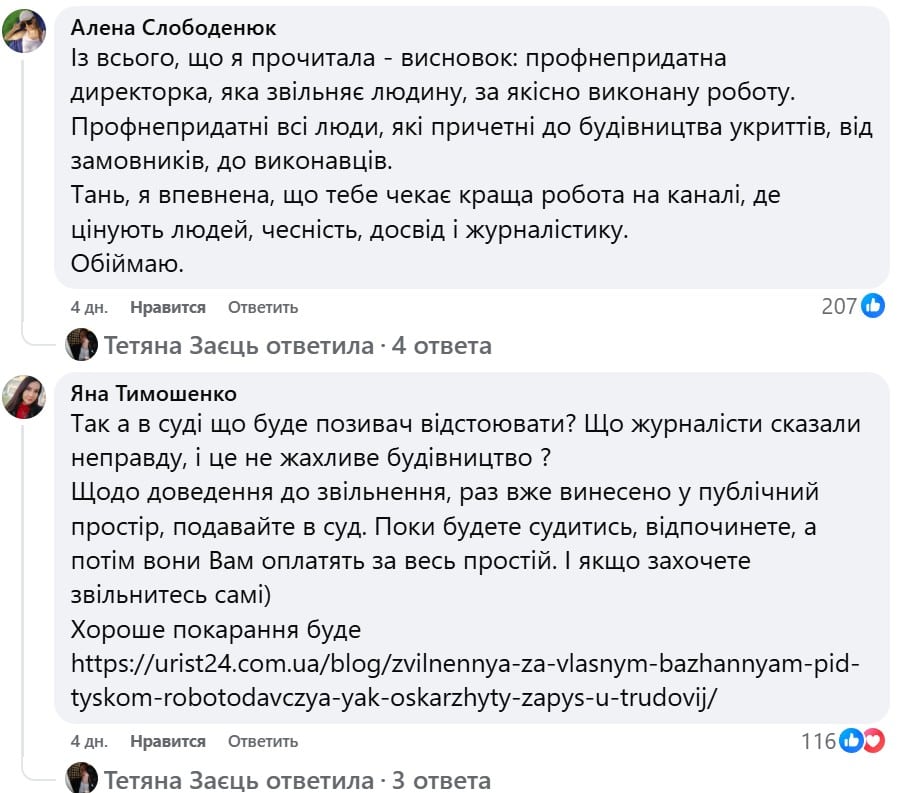 📢 «Я розраховувала, що ми всі сядемо і будемо думати, що я не так сказала і, як робити спростування. Я готова була до конструктивної розмови. Але цього не було! Мені з порогу тричі сказали: “Ти звільнена!”. Мені показували робочий матеріал цієї зйомки, обговорювали його, а не сам матеріал. Ніхто не говорив про те, як ми будемо робити спростування, мене просто морально знищували й перекреслювали всю мою роботу», – розповіла Тетяна Заєць.