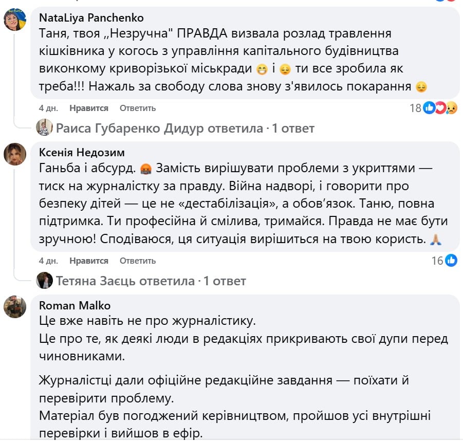 Журналістка визнає можливість помилки у підготовці матеріалу, однак наголошує, що на етапі продакшену сюжет не викликав зауважень. Вона також стверджує, що має підтвердження проблем зі станом укриттів і діяла в інтересах громади.