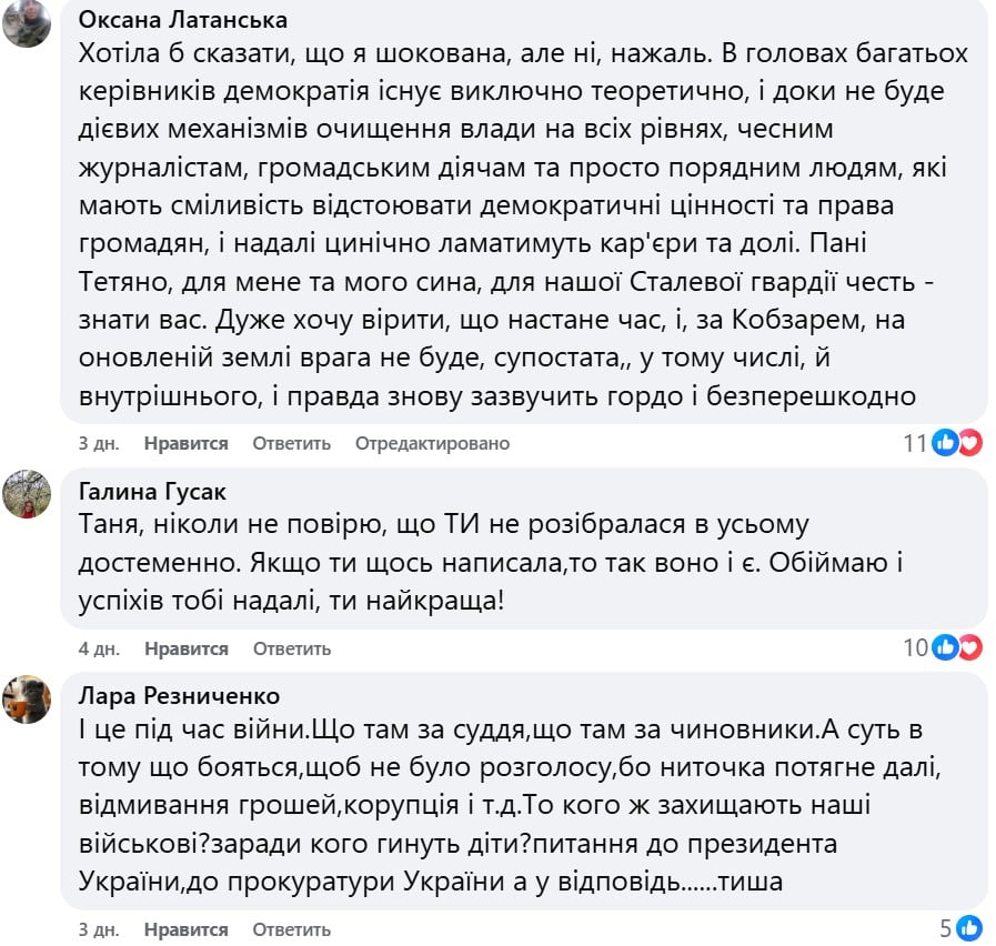 📢 «Мені тицяли “чорновим” матеріалом, в якому так, я могла помилитися. Але я не отримала жодної підтримки, взагалі якогось доброго слова, мене звинуватили просто в усьому! Виходить, я одна борюся з великою системою, з корпорацією, і, звісно, вони зараз переможуть, вони можуть говорити про мене все, що завгодно. Так, я могла помилитися, але те, що там укриття зіпсоване, – це точно! Мені і зараз пишуть люди, надходить інформація (джерел я розголошувати не можу) і підтверджують, що я не помилилася. І, головне, я діяла в інтересах цієї громади», – зазначила вона.