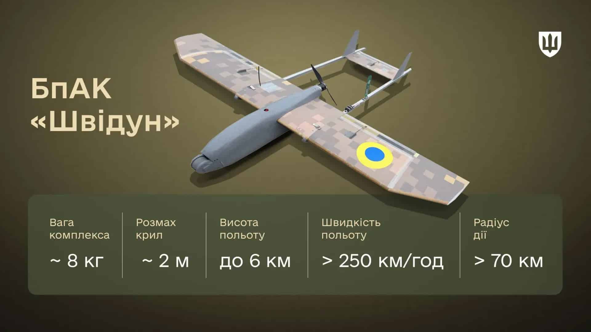 Безпілотний авіаційний комплекс «Швідун» виготовлений із міцного композитного матеріалу. Його основні параметри: